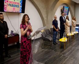 La maestra Leticia Lujano Cortés, representante del Comité Filosófico del SEMS, dijo que la Filosofía impacta en el entendimiento de todas las esferas sociales y desde todas las dimensiones: “Estamos aquí para retomar esa actitud socrática. Mientras exista una mente humana capaz e interesada en cuestionar la realidad; ahí habrá campo para la Filosofía”.