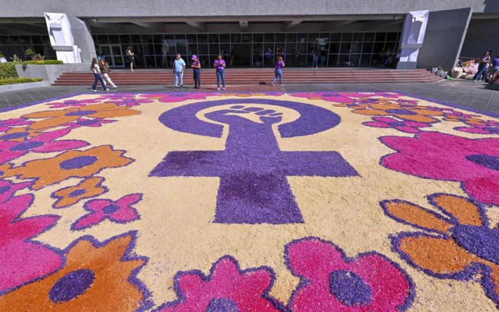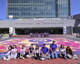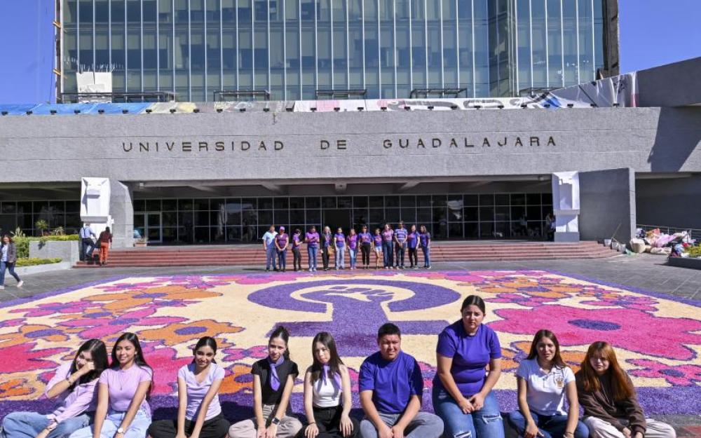 Estudiantes de diversas Prepas UDG participaron en el montaje de un “Tapete efímero” en la explanada del edificio de la Rectoría General de esta Casa de Estudio, mediante el cual buscan visibilizar las luchas en favor de la igualdad de género.