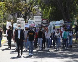 El contingente, integrado por 210 personas, partió rumbo a Casa Jalisco desde el edificio de la Rectoría General para realizar la entrega de 2 mil 408 cartas signadas por los jaliscienses para exigir la devolución del dinero recortado por el gobernador, por lo que ya suman 326 mil 183 las misivas dirigidas a éste.