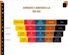 Los centros universitarios que admitieron más estudiantes fueron: el del Norte (CUNorte), de Chapala (CUChapala), de Lagos (CULagos) y de la Costa Sur (CUCSur), con 100 % de aspirantes admitidos.