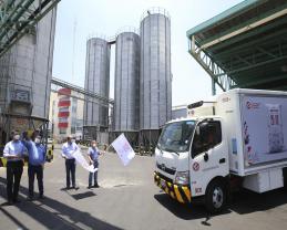 Los funcionarios realizaron un recorrido por las instalaciones de la fábrica de leche, además de dar el banderazo de salida al camión que llevará las despensas a los puntos de entrega.